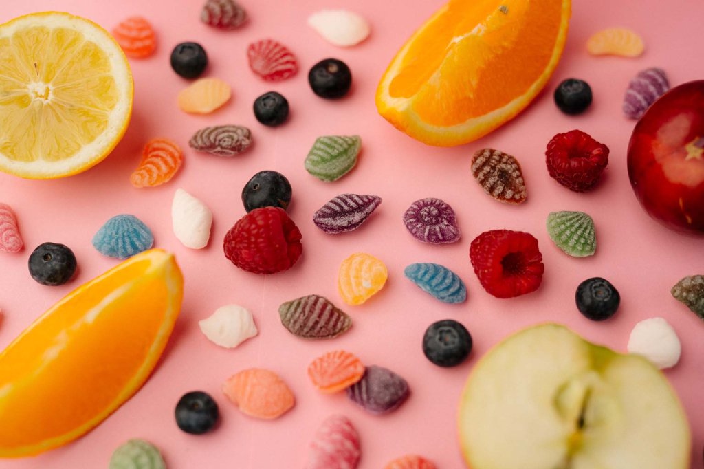 Zucker, Glukose, Weinstein-/Zitronensäure, natürliches Aroma, Farbstoff: Beta Carotin E160, echtes Karmin E120, E132, Chlorophyll E141, Zuckerkulör.